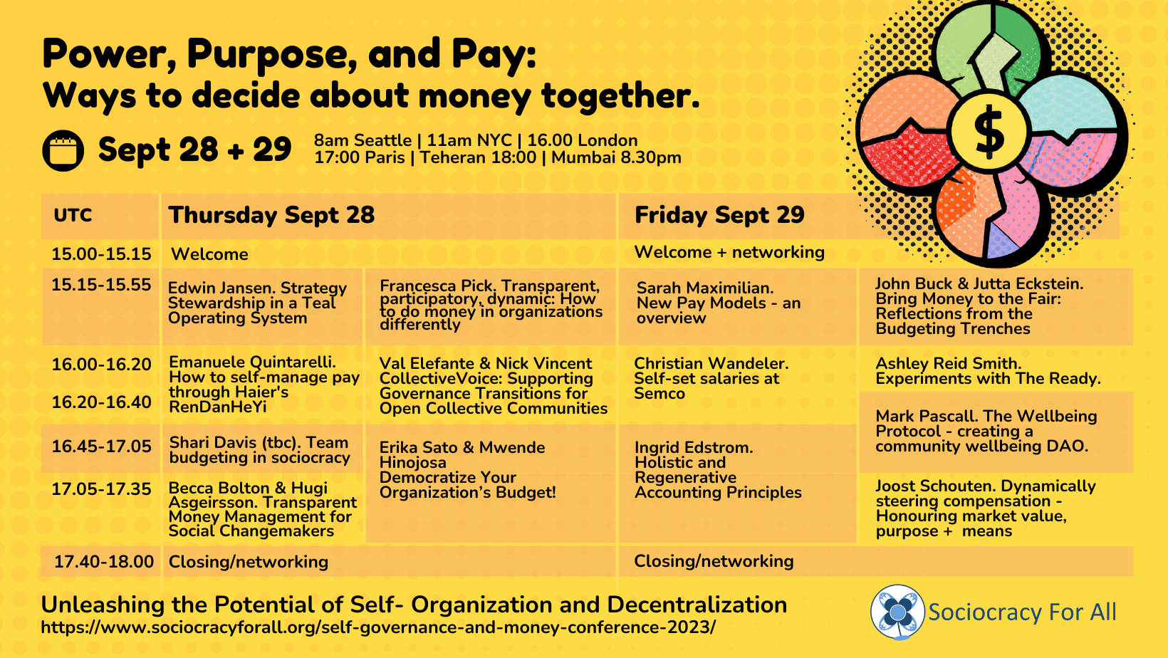 Get your Tickets: https://www.sociocracyforall.org/self-governance-and-money-conference-2023/